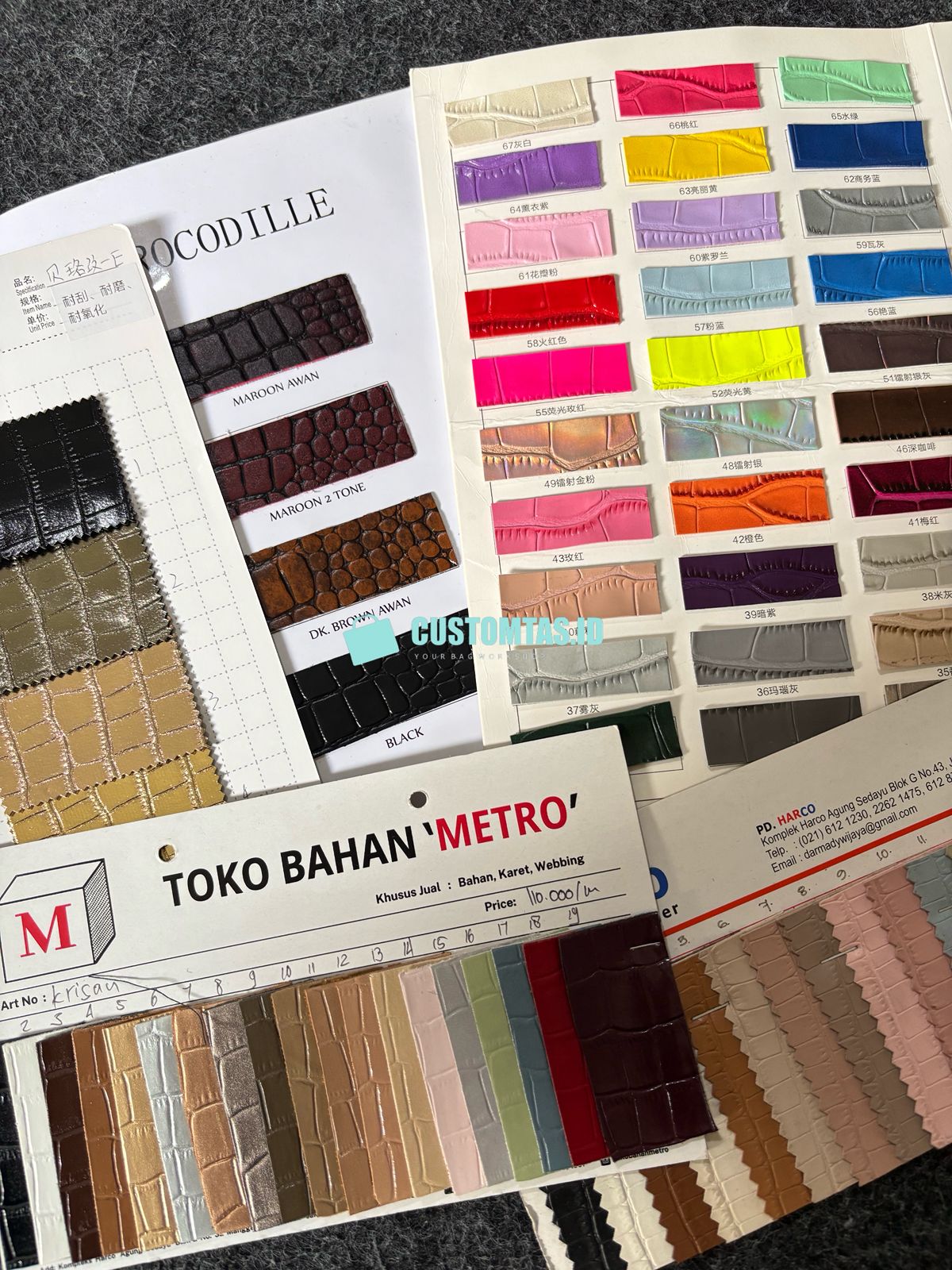Salah satu bahan yang paling diminati adalah kulit sintetis motif crocodile. Bahan ini memiliki tekstur unik menyerupai kulit buaya yang memberikan kesan elegan, mewah, dan eksklusif.